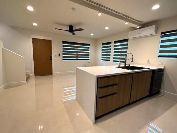 This is a modern/contemporary two-story home located in the sought-after North San Gabriel area. The residence is over 818 sq ft; it has two bedrooms and one full bath on the second floor. The master bedroom has large casement windows overlooking the mountain and a nice view of the neighborhood. The second bedroom with French door opening to a small balcony and the staircase leading to the private patio. On the first floor, it is an open-concept living room and kitchen area with a half bath. The kitchen has a large built-in waterfall quartz island extended for the working area as well as for dining. It comes with top-notch appliances (refrigerator, dishwasher, cooking range oven, microwave with built-in hood, washer and dryer, and other smart accessories). There is a separate laundry room and storage area within the house. The house has great curb appeal and is professionally landscaped. It is surrounded by beautifully maintained homes all in a sought-after school district. One year Lease