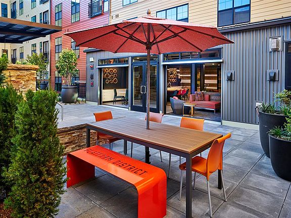 Rowlock Apartments - A Mashup of History and Creativity on the MAX. Start with a brick building inspired by the warehouses that once held the wares of the Oregon Nursery Company. Add a dash of industrial with a modern attitude, and call it home. Choose among studio, one- and two-bedroom, industrial-styled apartment homes at Rowlock Apartments in Hillsboro that are in the middle of The Platform District. Rowlock is conveniently located just steps from the MAX Blue Line and surrounded by local restaurants and shops. Everything you need is right outside your door. Our new apartment homes can come in one of two different varieties. One features almond cabinets and black quartz countertops, and the other has chocolate cabinets with white quartz countertops. Each comes with a full stainless-steel appliance package that includes a built-in microwave. An in-unit washer and dryer is included for your convenience, so you can do your cleaning from home. A walk-in closet in your bedroom allows you to store plenty of clothes. Your apartment has hardwood flooring throughout, and the bedroom has loop carpeting for comfort. The wall outlets throughout your home come with USB ports, so you can easily charge your devices. Rowlock offers a clubhouse with garage-style doors that lead outside. You can hang out in the lounge, which includes a coffee machine, free WiFi and modern art work. A private garage is offered with an assigned parking spot, and bike parking is also available.