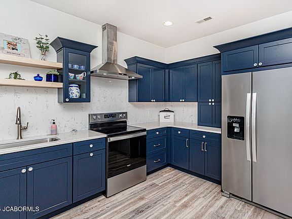 Oversized garageFront deckStorage roomCovered entryOpen floor planSplit bedroom designStylish navy blue cabinets