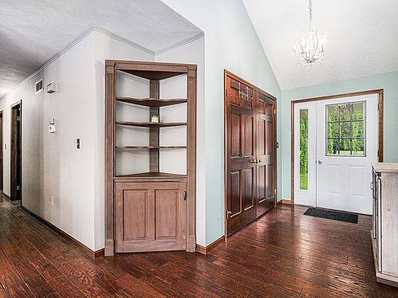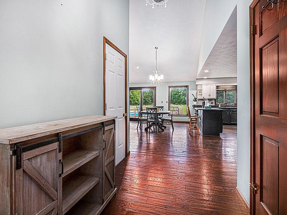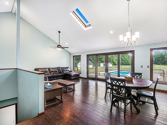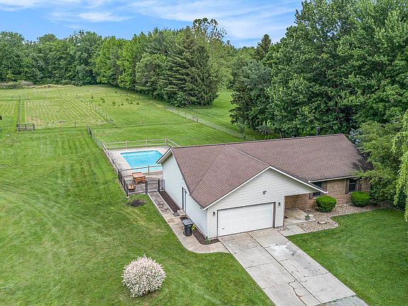 10+ acre MINI-ESTATE privacy and quiet country setting, yet close to town center and highway access. 3 bedroom, 2 bath ranch with partially finished basement and attached 2 car garage. Vaulted ceiling and open concept kitchen. Designer Series Pella doors provide panoramic views of backyard property. Skylight adds additional natural light. Primary bedroom has natural gas fireplace and sliding French doors for walk out to private hot tub. Basement has ample room for office, recreation and entertainment. There's even room for a possible 4th bedroom. Outdoor ambience of brick patio surrounds and in ground swimming pool (20 x 36 foot). Diverse areas of secured fencing for pets and grazing stock, barn to house animals, shed large enough for mower/lawn equipment and additional forested acreage. Buyers to confirm schools, taxes and measurements.