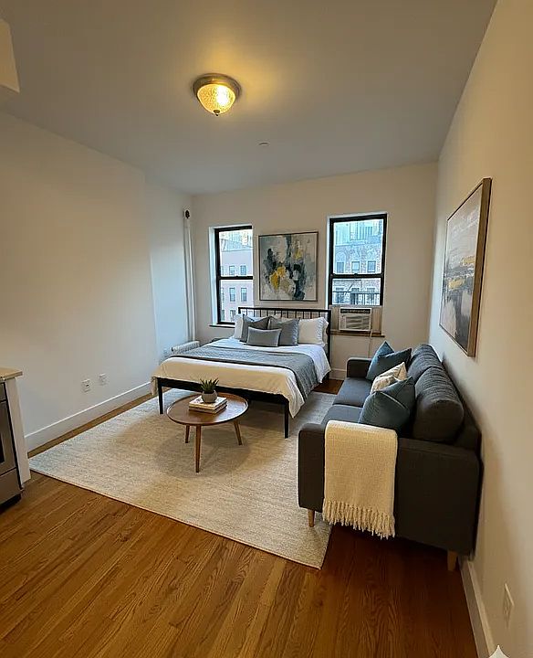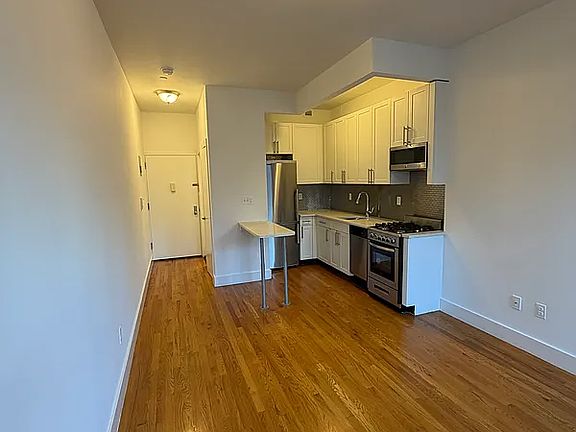 You won't believe this incredible find in the heart of Hell's Kitchen! This bright, charming studio apartment features beautiful hardwood floors and is located just three flights up. What truly sets this unit apart is the large eat-in kitchen with the works: it boasts stunning quartz countertops, sleek stainless steel appliances, a convenient dishwasher, microwave, stovetop, and oven. An air conditioner is also included for your comfort. The apartment offers ample closet space and is drenched in natural light, making the entire space feel open and airy. Located near several acclaimed dining options, this high-demand unit will not last long!