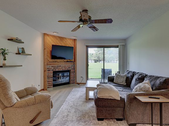 Cozy brick fireplaceModern finishesUpdated bathroomGenerous primary suiteQuiet dead-end streetIn-unit laundry roomSliding glass door