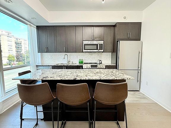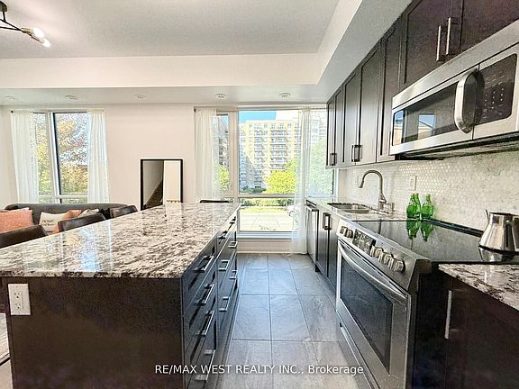 Welcome to sophisticated urban living at 639 Lawrence Ave W, located in the heart of Englemount-Lawrence. This modern stacked townhouse with unobstructed view combines style, convenience, and comfort for those seeking the best of Toronto's midtown. Step inside to find a bright, open concept layout illuminated by 9 ft ceilings, where living, dining, and kitchen areas flow seamlessly together. Kitchen perks include tall maple upgraded kitchen cabinetry, large kitchen island with 10 drawers, granite countertops, marble backsplash, undermount valance lighting, and touchless faucet & soap dispenser. Upgraded Blomberg fridge with bottom freezer, slide-in Frigidaire stove, brand new Frigidaire over-the-range microwave, and brand-new Bosch dishwasher with 3rd rack. Upgraded bathrooms with maple cabinets, Caesarstone quartz tops, upgraded Pfister faucets and shower fixtures, and frameless glass shower. Good size entryway closet, semi-ensuite & closet organizers in bedrooms, engineered floor (Torlys), upgraded lighting throughout unit, new tankless water heater (5K), 1 underground parking spot and locker. Outdoor space is a highlight; enjoy a private terrace complete with a BBQ hookup for summer gatherings. Located 2 minutes walk from Lawrence West subway station, and walking distance to Lawrence Square Shopping Centre (grocery, pharmacy, Winners, Canadian Tire, etc.).