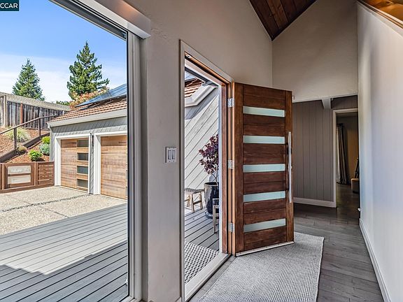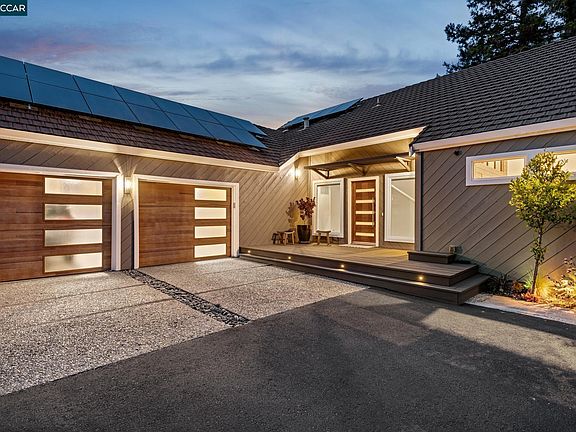 Welcome to Lafayette's desirable Sky Hy Ranch gated community. This stylish contemporary home offers a flexible floor plan filled with natural light, showcasing beautiful hardwood floors, soaring ceilings, and peaceful views. The main level features a spacious living room and dining room, an updated kitchen with stainless steel appliances, and a cozy breakfast nook. Step out onto the deck, surrounded by majestic redwoods, for a tranquil start to your day. The primary suite is a peaceful retreat with a recently updated bath, walk-in closet, and breathtaking views of the Lafayette hills. Down the hall is a bedroom with a sliding door to a deck and access to the beautifully landscaped backyard. The upper level includes two additional bedrooms, a full bath, and a playful loft area that overlooks the main living spaces. The downstairs flexible space with separate entrance is a perfect kids' hangout or an inviting in-law suite featuring a living area w fireplace, a full bath, and a sunlit bedroom with views and easy access to the rear gardens. Enjoy the terraced outdoor backyard with decks for dining, a grassy area for play, and a sandy play zone, all set against expansive panoramic views. Solar panels, Tesla Powerwall, excellent schools, and close to downtown Lafayette.