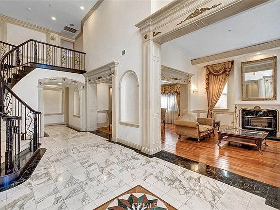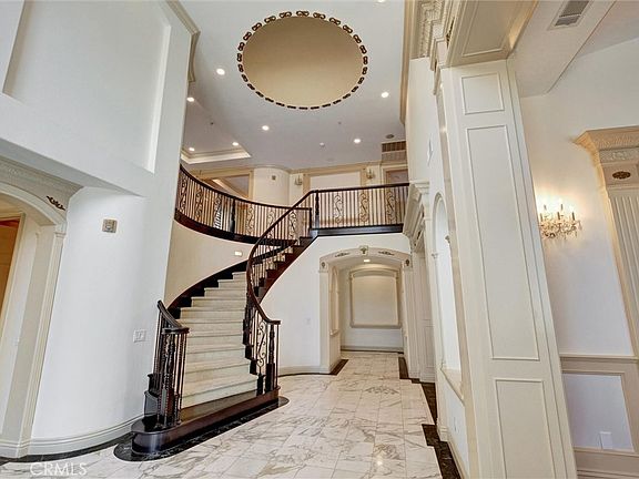 Spiral staircaseCenter islandGrand chandeliersMarble floorHigh ceilingKitchen with granite countertopsSecurity system