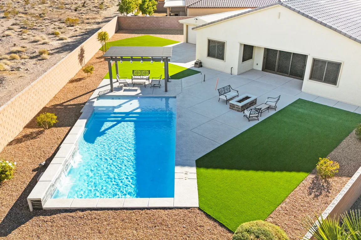 Self-cleaning pool with waterfallSpacious kitchenArtificial turfBuilt-in fire pitLarge islandInviting open layout