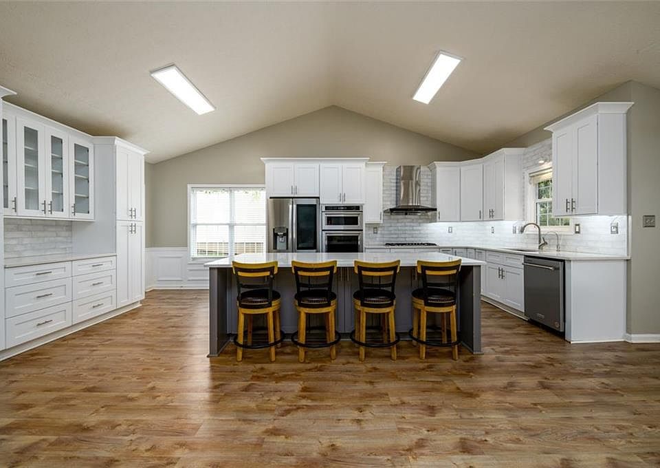 - Features: Breakfast Bar, Cabinets White, Eat-in Kitchen, Kitchen Island, Pantry, Solid Surface Counters, Stone Counters, View to Family Room