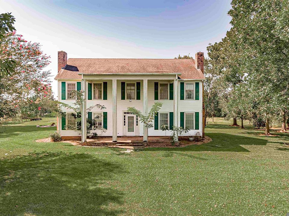Situated on 2.5 serene acres, this 3-bedroom, 2-bath Acadian-style home offers timeless Southern charm with endless potential. The stately façade with its towering front columns that stretch across the front porch, framing the classic symmetry of the two-story design, and classic green shutters, this home makes a timeless first impression. Mature trees, a wide lawn, and a welcoming brick porch set the stage for a property full of Southern character. Step inside to a spacious foyer that immediately showcases the home’s character. The grand staircase rises gracefully, accented by thick arched openings and wood details. Offering original wood floors, crown molding, and two inviting living spaces—a family room with a wood-burning fireplace plus a den with a second fireplace. The kitchen offers a spacious layout with an abundance of cabinetry, vintage details, and charming diamond-paned windows that bring in natural light over the sink. With its size and flow into the dining area, this kitchen is ready to be reimagined into the heart of the home. The formal dining room carries the home’s character forward with a graceful arched doorway, custom built-ins, and a large bay window with plantation shutters. Upstairs, the oversized primary suite includes a generous sitting area, walk-in closet, and an en-suite bath with a clawfoot soaking tub. Two additional bedrooms complete the second floor, while downstairs features a second full bath with a walk-in shower and a spacious utility room. Outdoors, a storage shed with a half bath adds even more function to the property. With its historic character, spacious layout, and beautiful acreage, this Acadian treasure is ready for an investor or visionary buyer to bring it back to life.