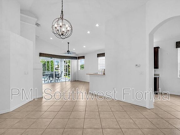 This home features a pool with screened in pool area overlooking a neighborhood pond.