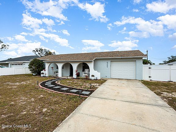 Move in ready concrete block home in the heart of Port St. John! This home features an inviting tiled archway porch, galley kitchen with white cabinetry, beautiful quartz countertops, a modern accented backsplash, along with a new stove and dishwasher. Laminate flooring throughout, and a large screened rear porch overlooking the large fenced backyard adorned with a paver patio, making for a perfect space for entertaining. The double swing gate perfect for parking additional toys such as a boat or RV. A 12x20 slab is already in place for a carport, garage or shed. For added peace of mind, This home has a newer roof (2019), Newer A/C (2023), and hurricane panels for additional insurance deductions. No cast iron plumbing, and this home is not located in flood zone. Watch the rockets launch right from your backyard! Nearby shopping and dining. Located just 40 Min from Orlando, 20 min to Viera, 20 Min to Blue Origin & Space X.