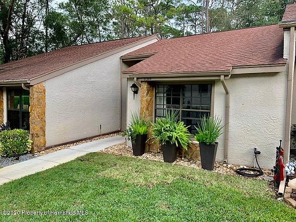 Beautiful 1 Bedroom 1 Bath Villa in Award Winning Timber Pines! This property has had several updates, and a fresh coat of paint. It is Move-in ready, and is minutes walk to the Lodge with all the Amenities that Timber Pines has to offer. The current owner added a Spacious elevated 16x18 Paver patio, with majestic wooded views. The unit has an updated Kitchen, with Tile in most areas. The Bathroom Vanity, Light, and Toilet are all newer. Bedroom has beautiful newer vinyl plank floors. Roof straps have had 3rd nail added for Insurance discounts, and flooring in attic for extra storage. This could be a full time residence, or a Seasonal getway for someone wanting to enjoy our Beautiful Community and weather. Carport for your vehicle, or golf cart. Plus an additional storage locker that comes with the unit. Washer & Dryer Included!! Timber Pines is a 55+ Gated Community, with 3 Golf Courses, and a 9 Hole Pitch & Putt, County Club & two Pools, Fitness Center, Tennis & Pickle Ball Courts, Bocce Ball, Billiards Hall, Performing Arts Center, and over 100 Clubs, Spectrum Cable with High-Speed Internet included in your Monthly HOA. FURNITURE NEGOTIABLE!!