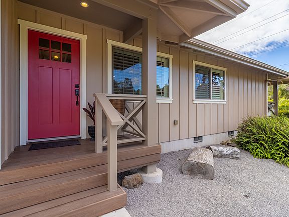 A custom 2019 construction Waimea home on a fully fenced and gated 37,636 sqft property is located on beloved White Road, just 3 miles from the heart of town. Built solid with a stem-wall foundation, the home welcomes you warmly with a grand, two-sided, slate fireplace. Open to the fire-side dining area, the kitchen offers a central island, range/oven with convection option and a hood vent, and a doorway leading out to the home's largest porch area. All 3 of the home's bedrooms also have access to the exterior, providing the option for separate entryways as needed. In the primary suite, you'll enjoy a spacious shower with dual heads, a walk in closet with access to handy under floor storage, and sliding doors leading out to the peaceful back yard, where an attractive shed/workspace awaits your dream projects. The home's 2nd bedroom has its own private porch. Clever design touches in the bedrooms include open top closets to maximize air flow. Between the 2nd and 3rd bedrooms, just off the main living area, a guest bathroom with a dual head shower shines with native koa wood cabinetry. The 3rd bedroom has access to the largest porch near the exterior kitchen door. Outside, this park-like parcel with level topography has an expansive lawn and landscaping featuring non-invasive bamboo for privacy as well as desirable trees such as tangerine, orange, cherry blossom, vanilla banana, avocado, and ohia. A 42 inch deck riding lawn mower is included with the sale. The attached 2 car garage features a quiet, side mounted garage door opener, a sliding door out to the sideyard, a laundry area with a large window, and a utility sink. Ideal during power outages, a 10 panel PV system with a whole-home battery backup is ready in an emergency. All of the comforts and beauty of this well appointed, well cared for "Emerald Side" gem home must be experienced to be fully appreciated!