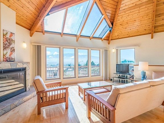 Vaulted ceilings, wrap-around lanais, and two fireplaces, creating a warm and inviting atmosphere.