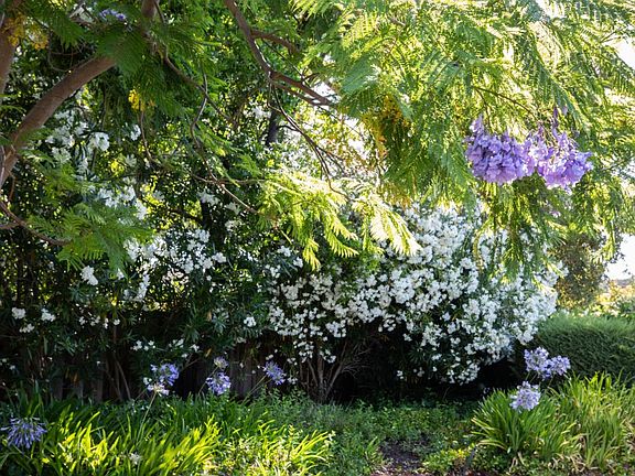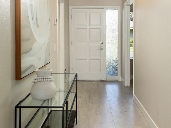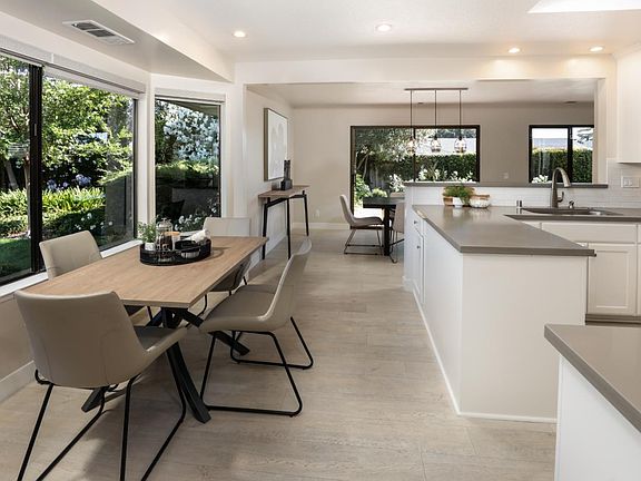 Peaceful single-level 2/2 in the center of the elegant North Los Altos gated community, Creekside Oaks. Corner unit on 2,704 +/- sf cul-de-sac lot with rare private-use backyard of white roses & lavender. Eat-in kitchen with bay window sitting area. Neutral white subway tile backsplash and grey countertops accent the cheerful kitchen with stainless steel appliances. Formal dining room accented with contemporary Room & Board light fixture, sliding doors to beautiful backyard garden, and oversized patio. Open plan living/dining room with gas fireplace and built-in bar. Numerous skylights and sunny atrium fill the home with natural light. Generous primary suite with enormous closets and updated primary bath. The 2-car garage includes built-in storage cabinets, a washer, a dryer, and an EV charger outlet. Additional fine features: easy care, wide plank faux hardwood floors, recessed lighting, central air conditioning, and remote control window blinds. Serene 19 acres+ neighborhood includes beautifully manicured gardens, tranquil ponds, shimmering fountains, heritage oaks, a historic barn, a meandering creek, two neighborhood swimming pools, one jacuzzi, and a bocce ball court. Superb Los Altos schools - buyer to verify enrollment.