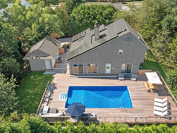 Step into your perfect Hamptons retreat-where modern style meets coastal charm. This newly renovated 3-bedroom, 3-bath contemporary is tucked just off Lumber Lane in Bridgehampton, placing you minutes from the chic boutiques and dining of Bridgehampton town, the world-class beaches of Sagaponack and the vibrant energy of Sag Harbor Village. Inside, soaring cathedral ceilings and an open floor plan create an airy, light-filled atmosphere. The sleek, renovated kitchen flows seamlessly into the dining and living areas, making entertaining effortless. Sunlight pours in from three sides, and sliding doors open onto a private, resort-style deck complete with a heated pool, BBQ, and abundant lounge seating-from chaise lounges and daybeds to a plush outdoor sectional. Two guest bedrooms and two full baths (including one conveniently located off the pool) are set on the main level, while the primary suite upstairs offers its own private escape. Enjoy a fully renovated spa-like ensuite bathroom and unwind with evening cocktails or stargazing on your west-facing deck as the sun sets over the Hamptons sky. Eco-friendly solar panels will offset your electrical cost, and brand-new central A/C keeps you cool all season. High-speed fiber internet ensures you stay connected (if you choose), while access to three private tennis courts just around the corner adds to the lifestyle perks. Whether it's lazy summer afternoons by the pool, evenings entertaining friends, or day trips to the beach and vineyards, this home sets the stage for an unforgettable Hamptons summer.