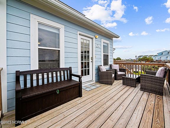 Fully renovated in 2023, this upgraded 2 BR/2 BA townhome is located in the highly desirable community of Bermuda Landing. Just one block from the nearest public beach access and centrally located on Topsail Island, this home offers everything you could want in island living. The main living room includes cathedral ceilings and large windows with views of the ICW. Because it is an end unit, there is additional natural light flowing through the main living space and master bedroom. Enjoy cooking a delicious dinner in the fully upgraded kitchen with granite countertops, all new appliances, and ample storage space with cabinets all the way to the ceiling. On the main floor is a bedroom with large walk in closet and its own private deck with ocean views. Upstairs you will find the master bedroom with ensuite bathroom and windows viewing the ocean. Additionally the garage has been re-finished and features games, bar, mini fridge, tv, and hangout area. HOA dues are low and include access to the neighborhood pool and fishing pier. This place has everything and will be sold fully furnished! Come check it out now!