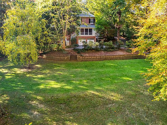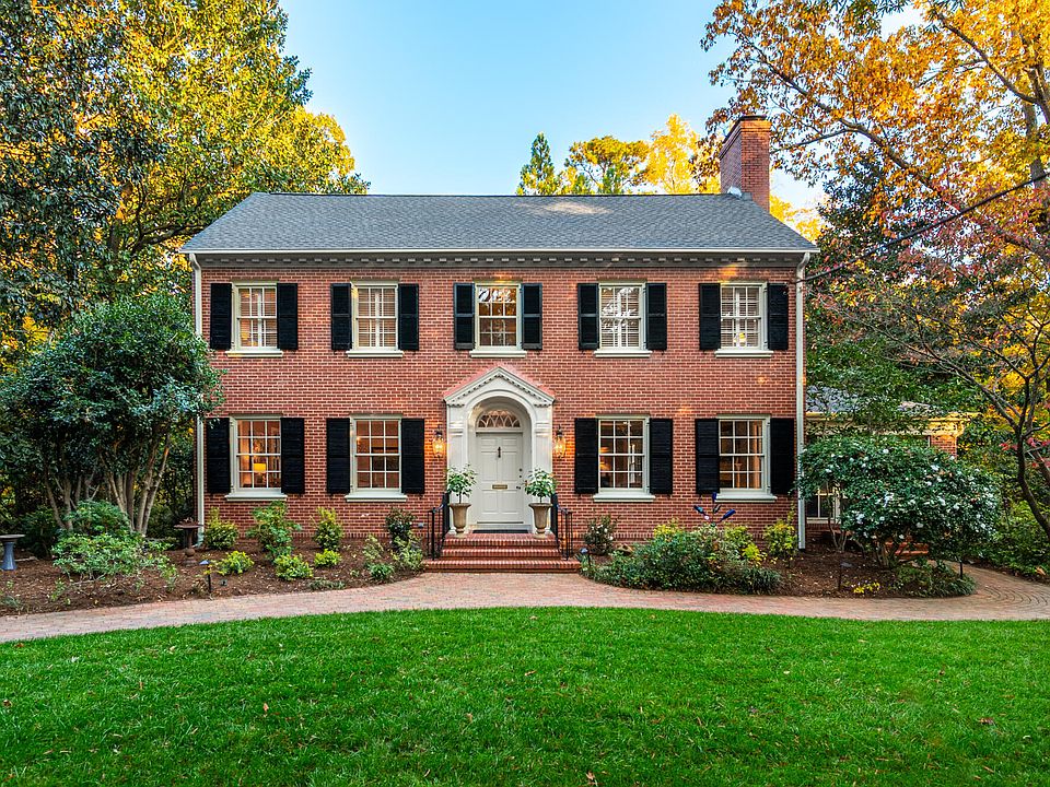Be prepared to be swept away by the historic charm and serenity of this Kenneth C. Royal Forest Hills historic home. This beautiful all-brick Colonial-Revival home, originally designed by the talented Robert W. Carr in 1952, exudes timeless character and warmth. With its inviting two-story side-gable facade, lovely front door adorned with a fanlight and classic 6-over-6 sash windows, this home is a true gem. Nestled on one of the largest lots in Forest Hills, this enchanting residence offers stunning historic details blended with modern comforts. Step inside to discover original hardwood floors and moulding details, two cozy screened-in porches and two wood-burning fireplaces, creating an inviting atmosphere for gatherings and quiet evenings alike. The main level flows beautifully around a spacious central foyer, leading you into expansive living and dining areas, a charming library/den complete with built-in bookshelves and cabinets and a sleek chef's kitchen. Upstairs, discover four generously sized bedrooms and two fully renovated luxurious bathrooms with mosaic marble floors, marble tile and high-end finishes. As a delightful bonus, the expansive basement includes a carpeted bonus room and office perfect for a lounge area, in-home gym, yoga retreat or creative pursuits plus attached 2-car garage. Set on a rare 2.35 acre wooded lot, this home provides a private retreat surrounded by towering hardwood trees, all while offering convenient access to the scenic American Tobacco Trail. The meticulously maintained yard is a paradise in itself featuring magnificent magnolia trees, vibrant flowering shrubs and water feature for endless outdoor enjoyment. Step into the terraced backyard, where adventure awaits with a charming tree house, a fun tire swing and in-ground basketball hoop. This enchanting home is not just a place to live but a place to create cherished memories. Close proximity to downtown Durham, DPAC, DBAP, Brightleaf, American Tobacco Campus, Duke Hospital, I40 and I85.