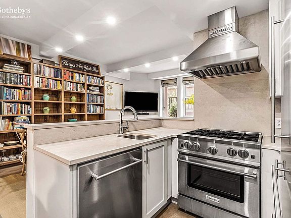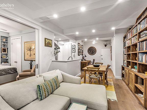 Carnegie Hill Garden Beauty. Prewar charm, light-filled, located near Central Park and its renovated to perfection! This pristine Carnegie Hill Garden retreat brings character and personality to its contemporary lifestyle with “Country Inn Getaway” appeal. Compact and perfect, the design incorporates hidden storage with high-end custom cabinetry, hideaway bed storage and generously proportioned closet space. The floorplan includes an office area, indoor dining table with seating for four, living room with ventless fireplace, high-end chef’s kitchen, cozy bedroom with king-size bed and a south facing gardeners stone slate patio. The bespoke renovation boasts exceptional attention to detail. From the concealed screened patio door to the curated bookshelves to the selection of finishes, every detail was considered. Central air, oak hardwood flooring, custom stainless steel hearth fireplace, selection of high-end appliances including Blue Star gas oven, Liebherr refrigerator and Miele dishwasher, pantry closet, Silestone counters and built-in Sonos sound system. The fully renovated bath includes both an overhead shower and handheld spray. Entertain inside or outside on your 189+/- square foot sunny garden retreat. Tranquil and serene, all windows overlook the garden.