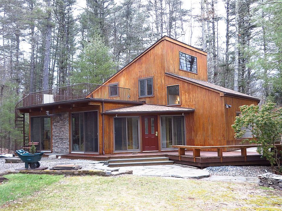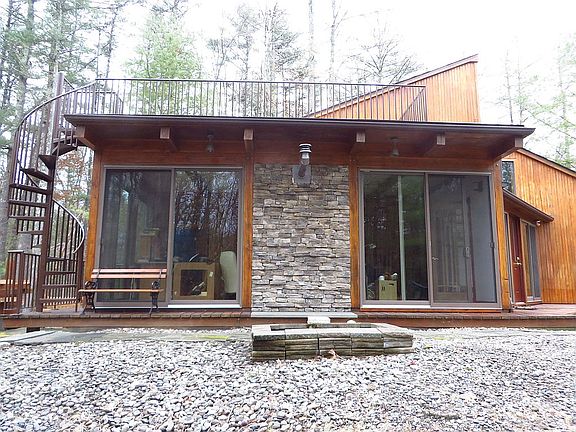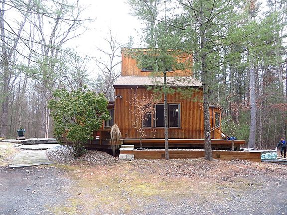 Very cool cedar sided contemporary in the woods! Located in uber-hip Saugerties just 4 miles from Woodstock Village, this midcentury modern architectural gem offers outdoor living on its decks and bluestone patios, on over an acre of private woods. Inside, angular lines and a stunning double height open floor plan and cedar ceilings creating an inviting space to enjoy and entertain. An additional super large, beamed sunroom/studio with pellet stove (potential for a master bedroom suite). Great potential for a rental as well. Propane central heating and central air-conditioning will keep you comfy all year round. And a generator hook up too! The house features insulated front and back Thermo-tru glass doors for easy access to the wraparound deck. The downstairs bedroom has plenty of walk-in closet space as well as a full bathroom with teak floors and ceiling. Upstairs, the second level dramatic loft den/office provides a cozy sitting area, office or art studio. Also second bedroom, half bath, and a huge storage space with W/D. A house for every season! You will love and enjoy this sophisticated retreat.