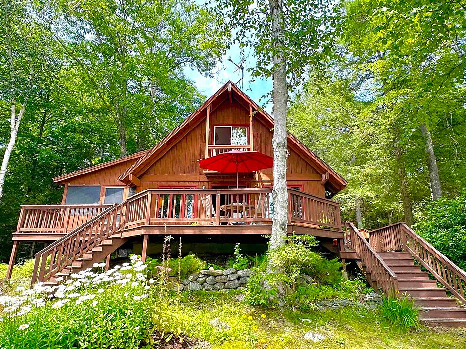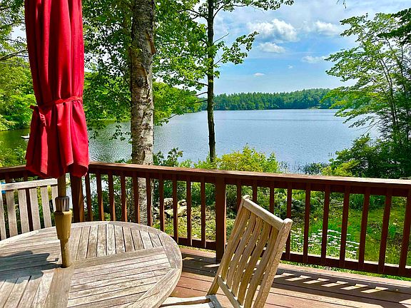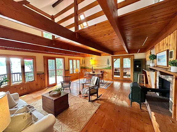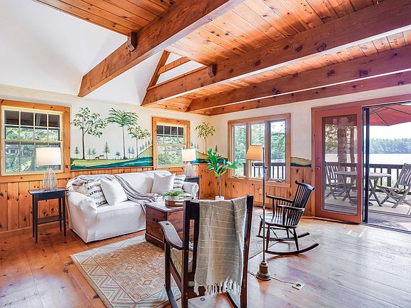 This idyllic slice of heaven sits right on the shore of a hidden gem called Frost Pond in desirable Dublin NH on a private 1 acre lot with 180ft of waterfront! A perfect blend of rustic and open concept, this sweet 2 bedroom year-round home has an open first floor centered on a Jotul gas stove and hearth surrounded by wide plank pine floors and walls with thick beams above. The kitchen sports a gas stove, dishwasher, fridge and a view of the pond along with a handy breakfast bar. An oversized screen porch runs the side of the home and also includes water views with built-ins perfect for a game of cards and plenty of room for a slumber party! Finishing the first floor are a bedroom adjoining a full bathroom with tub while the back of the building is a functional space for laundry, storage, mudroom or an office plus a 1/4 bath! Up the solid wood stairs to the loft, you'll find a generous master bedroom and sitting area with vaulted ceilings and outdoor balcony offering a great spot for coffee and a view of the pond. Adjoining this lovely space is yet another bedroom or office space also with vaulted ceiling. Outside, an enormous deck provides front row seats for the peaceful pond, long loved for swimming, fishing, kayaking or simply to get away from it all! Special bonus: a bunk house with room for 2-4 bunks or boats, complete with stone fireplace--what more could you want? This special place been in this family for decades and is now ready for new memories! Being sold As-Is.