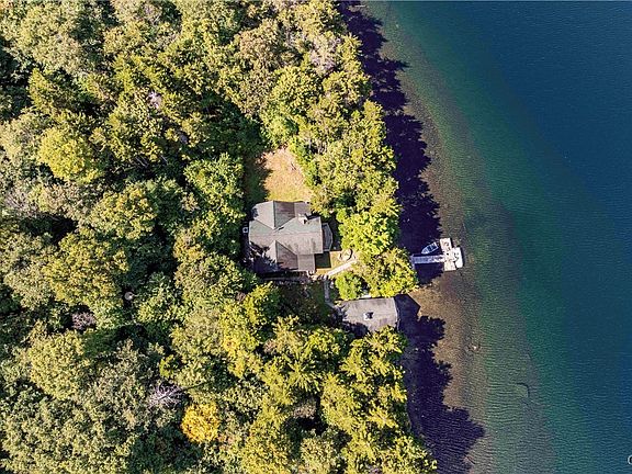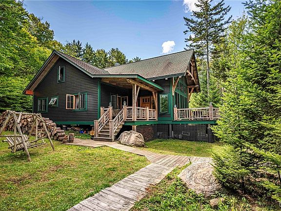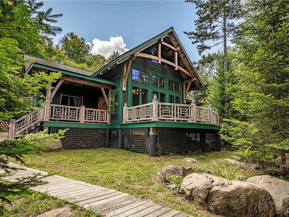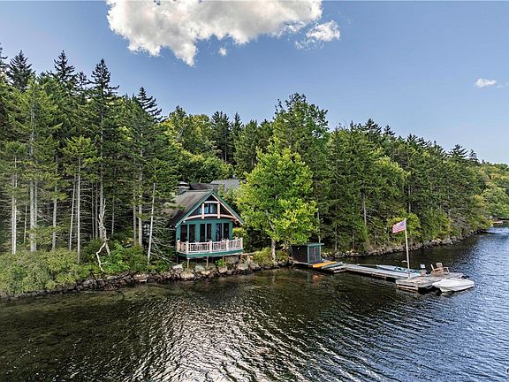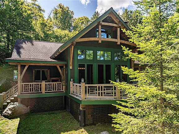 This well built post and beam home and guest cottage were constructed by New Energy Works. The main lodge offers 3 bedrooms, a loft, a work out area, and great room with stone fireplace. There are many places to enjoy the view, the open deck on the front, the screened side porch or the covered entry. The guest cottage is one room divided by a massive stone woodburning fireplace. The pies de resistance is the porch over looking the water's edge. It has 180 degree views of Honnedaga Lake, one of the purest, spring fed lakes in the Adirondack Park. There are several trout species that are unique to this lake and the fishing is excellent. You must access this property by boat from the landing area at the other end of the lake, about 5 miles. However, the boat ride is part of the experience and affords unlimited privacy. The Adirondack League Club is composed of 50,000 acres of private property and membership in the Club is necessary to purchase property. All purchases must be in cash. There is a clubhouse called Forest Lodge that offers amenities for the owners; meals and beverages during the summer months, a food and supply store, recreation and gathering places, a tennis court, pickleball court and miles and miles of hiking trails. Members have the opportunity to recreate in all the other clubs and lakes within the Club. The owner has Starlink set up for internet.