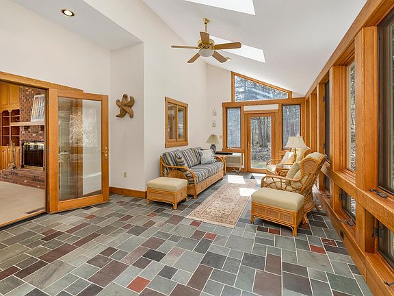 Spectacular brick front cape with attached 3 car garage. Large suite over the garage with with potential studio/bedroom. Vaulted ceiling fam room with large brick fireplace. Formal dining room, living room w/fireplace, fully applianced kitchen, and many custom built-in features. 3 season sunroom with skylights, loft area with skylights and built-ins. Super finished L.L. game room with wet bar, Large 3-bay garage with basement access. Mahogany deck and wired for portable generator. Private 5 acre lot with easy access to Manchester and the regional airport. Ready for occupancy .