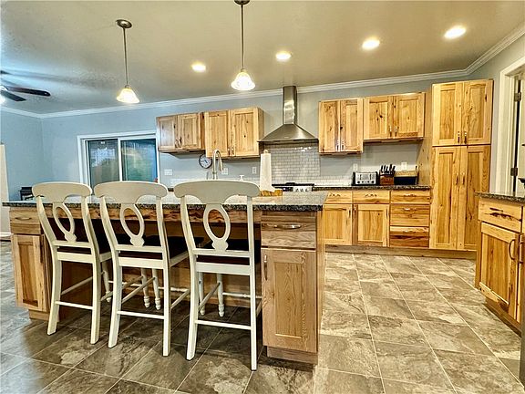 Just outside of town tucked away in the hills of Catlin close to Watkins Glen & Horseheads, this home offers privacy & an outdoor enthusiasts paradise. Situated on 26+ acres with large pond, this 2007 ranch offers open living space, 4 bedrooms & 2 full bathrooms. Come sit in the recently updated kitchen renovated in 2023 including knotty hickory soft close cabinets, granite counters, large island with seating & large ceramic farm sink with dishwasher. Hidden garbage storage, gas stove/ oven & stainless hood fan, side by side refrigerator (2025). Off the kitchen is the laundry room & walk in pantry with door leading to covered deck where hot tub sits. Plenty of counter space and cabinets, room for a few to cook & share the space while leading into the spacious living room make the new kitchen the heart of the home with a Harmon pellet stove to warm this area (and the whole home) & offer a cozy ambiance. There is also a space for a dining table. On one side of the home is 3 generous bedrooms with a full bath, on the other side is the owners suite with walk in closet & oversized private bathroom with walk in shower, large soaker tub with electric fireplace, double vanity, separate toilet room & linen closet. The home offers newer bamboo & laminate flooring, crown molding throughout, and an amazing walk up attic space spanning the length of the home that could be finished for an additional approx 1000 sq ft of living space! Enjoy the front deck or back covered trex deck to enjoy nature. Take note of the new off grid log cabin used for guests with an outhouse & outdoor solar shower over looking the pond. A perfect retreat with queen bed, sofa, table & kitchenette! Included on the property is a heated detached 2 car garage with 7' door & 9' ceiling at peak, electric and workshop space. There is a chicken coop with running water & electric, barn used for smaller animals & 2 car carport. There is a 24' round above ground pool included with sunning deck. The spring fed pond is 14' deep. Multiple hunting stands will stay, some inclosed. Come enjoy country living with all the amenities!