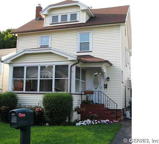 This one is a MUST see! Dramatic architectural details abound in Living & Dining rooms with crown moldings & built-ins. Wood burning fireplace. Central Air. Newer vinyl windows. Two absolutely gigantic bedrooms. Master bedroom has heated nursery/office overlooking spacious backyard. Bedroom 2 has walk up attic access for add'l space/bedroom. Updated porcelain tile bathroom. Hardwood floors throughout. Huge moveable island in kitchen stays for cooking convenience. Steps to Seneca Park & Zoo. Bike/Hike Trails, playgrounds & more(cut through access@ end of street).West Irondequoit Schools!!!