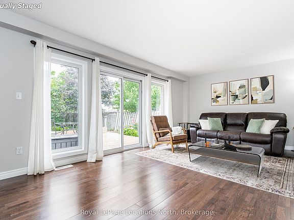 With over 2000sq ft of living space, this updated Georgian Meadows 3 bedroom, 2.5 bath home is priced to sell. Located in one of Collingwood's most desirable developments along a quiet crescent with excellent neighbours, this home features an open concept floor plan with a walk-out to a composite deck and beautifully landscaped and fenced yard complete with vegetable garden, shed and hot tub setting/hook up. The oversized garage provides direct entry and includes plenty of built-in storage. Upstairs you'll find three good sized bedrooms including a spacious primary with cathedral ceiling and space for an office nook. A 4-piece ensuite privilege bath and convenient newly renovated laundry with updated washer/dryer complete the second floor. The basement level was newly renovated in 2021 with a new 3 piece bath and features a cozy gas fireplace in the spacious rec room with plenty of room for kids to play. Other updates include roof (2018), central a/c (2018), fridge (2024), dishwasher (2021), Washer/Dryer (2025), and a fully owned hot water tank (2024). The entire home has also been freshly painted (2025). This is a fantastic deal in a highly coveted neighbourhood you don't want to miss!