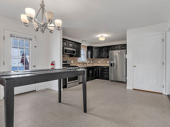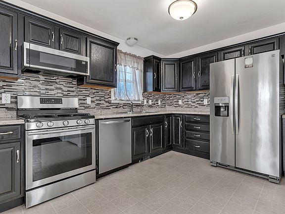 The updated kitchen is a highlight, featuring stainless steel appliances (including a refrigerator, stove, microwave, and dishwasher), ample cabinet storage, and elegant backsplash tile that adds a modern touch.