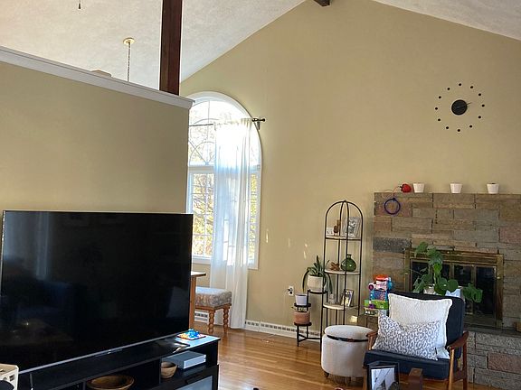 Hardwood floors throughout 1st and 2nd floors, with tile in the kitchen and baths. Gorgeous LR/DR areas share soaring cathedral ceilings, decorative stone fireplace, and beautiful arched window, where sun pours in! Spacious eat in kitchen with granite counters, gas stove, dishwasher and stainless steel refrigerator. On the second floor are 3 good -sized bedrooms, each with ample closet space, and bathroom.