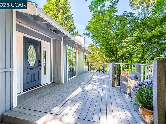 Nestled on an oak-dotted hillside in the heart of downtown Orinda, this 2,000 sq ft home combines serene natural beauty with unmatched convenience. Enjoy panoramic ridge-line views from nearly every room, while being just moments from Orinda Theatre Square's restaurants, shops, and BART station. Vaulted ceilings create an airy, light-filled ambiance in the main living area, which flows effortlessly into a scenic dining space and chef’s kitchen featuring granite countertops and stainless steel appliances. An oversized upstairs primary ensuite with spa-like bathroom along with two additional secondary bedrooms complete the upstairs retreat. The versatile lower level includes a spacious private guest suite with separate entrance—perfect for a home office, in-law setup, or additional family room. Situated on a 0.77 acre lot, the outdoor living is just as inviting, with multiple decks and tiered patios designed for sunset views, al fresco dining, and tranquil mornings with coffee in hand. A large low maintenance lawn area provide entertainment for family and friends year-round. With access to top-rated Orinda schools and nearby hiking trails, 64 Muth Drive offers a rare combination of peace, practicality, and timeless Orinda appeal. Don't miss this commuter's dream home!