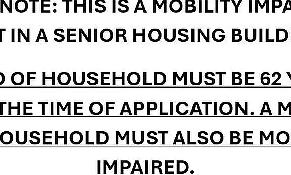 SENIOR HOUSING+MOBILITY IMPAIRMENT UNIT: THE HEAD OF HOUSEHOLD MUST BE 62 YEARS OR OLDER AT THE TIME OF APPLICATION. ALSO, AT LEAST ONE MEMBER OF THE HOUSEHOLD MUST BE MOBILITY IMPAIRED.