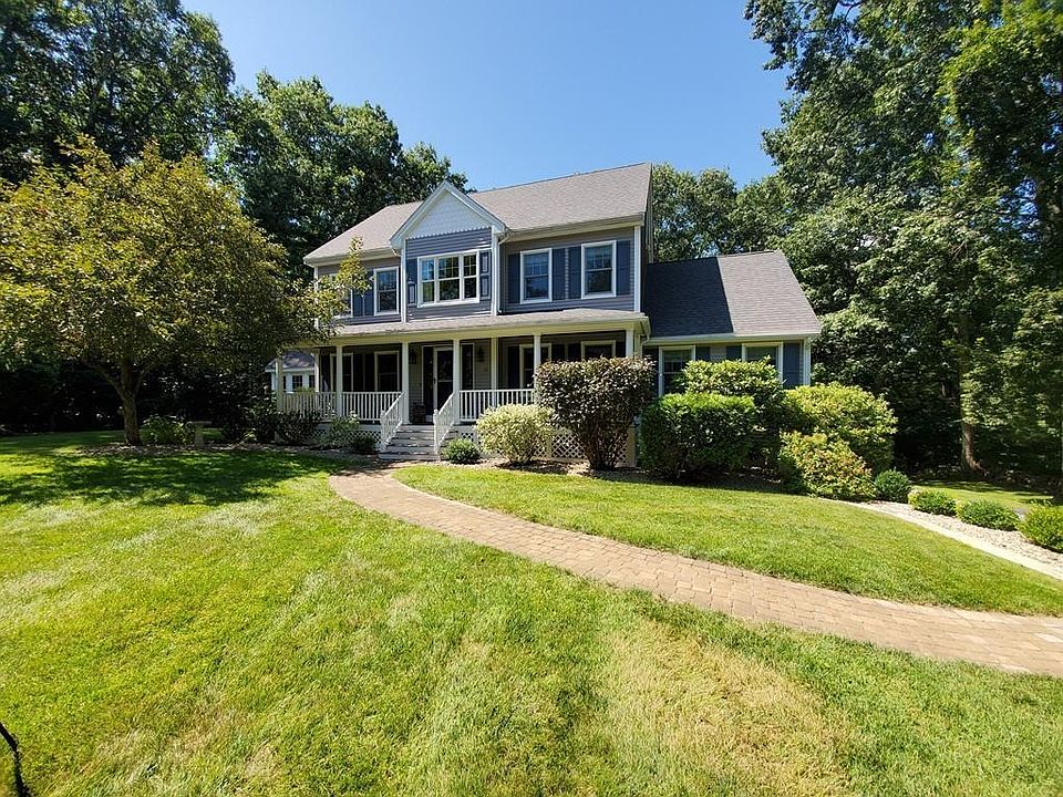 Elegance , quality and space abound in this immaculate center entrance colonial. Better than new colonial features 8 rooms, 3 bedrooms, 2.5 baths, 2 car garage, walk up attic and full basement, situated on a large flat 1.1 acre lot in sought after neighborhood. Spacious eat in kitchen with Cherry cabinets and quartz counters, tile back splash, SS appliances, breakfast bar and atrium doors leading to deck, formal dining room with crown molding, formal living room or office, large fireplaced family room with cathedral ceilings. An added bonus to the first floor is the 16x20 3 season sunroom with cathedral ceiling . The second floor features 3 generous bedrooms, the master suite offers a spa like updated bath with steam shower, free standing tub, double vanity, and radiant heated floors. Gleaming hardwood, new roof, central vac, security system, first floor laundry, large hardscape patio overlooking gardens and wooded lot, and farmers porch. Generator ready. Nothing to do but move in!