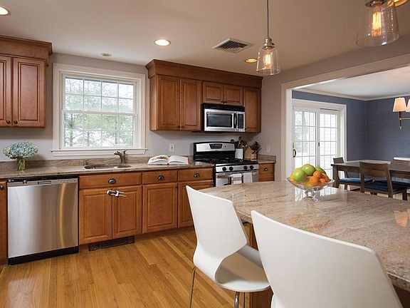 Well-appointed, classic Colonial located in a desirable Mitchell School neighborhood. Everything today's buyer wants with a thoughtful, open layout. Oversized, attached two-car garage enters into a generous mudroom with built-in cubbys for storage. The kitchen features maple cabinetry, granite countertops and a built-in desk which leads into a separate large pantry opening to the sun-filled dining room. The first floor offers both a formal living room as well as a separate family room. There is also a powder room on the first floor. The second floor features three bedrooms, a laundry room and a generous master suite with walk-in closet and master bathroom along with an additional full bathroom. The finished lower level has a carpeted playroom with great ceiling height. Flat backyard. 2010 roof, gas heat, 2014 water heater, newer windows and doors and first floor hardwood floors refinished. Central A/C.