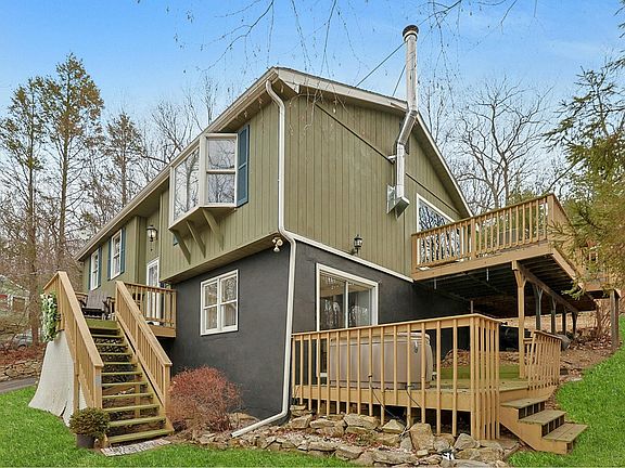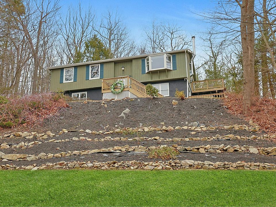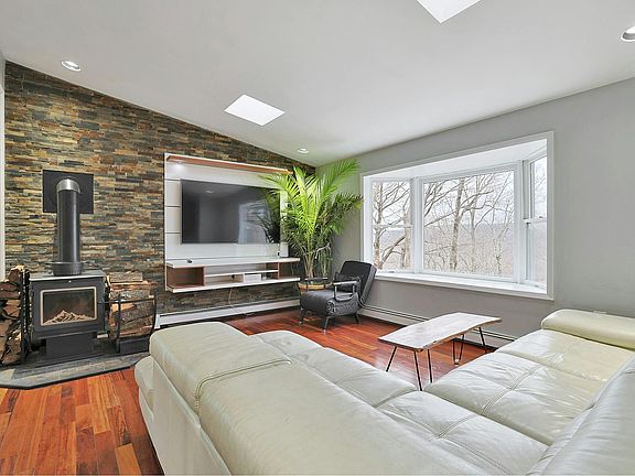 *Partial Hudson River views and commanding vistas make this 3 bedroom / 2 bathroom a standout. *Bright and modern cabin vibes. *Light-filled.*Open-plan. *Wood-burning stove. *Brand new chefs eat-in kitchen *2+ hike-ready and mostly wooded acres stretching to the top of the mountain ridge. *Situated near the end of a quiet and private road. *Living room, family room and 2/3 bedrooms enjoy tree-top-like panoramic views. *Two-sided and two-level deck provides significant extended living, dining, cooking opportunities.