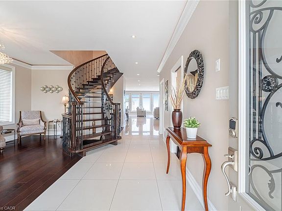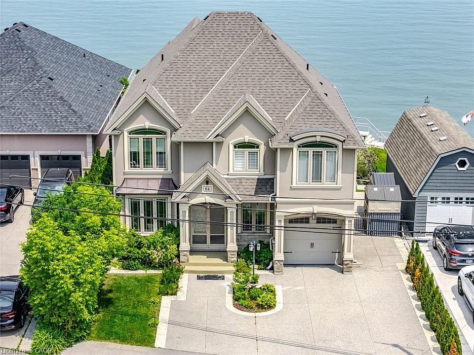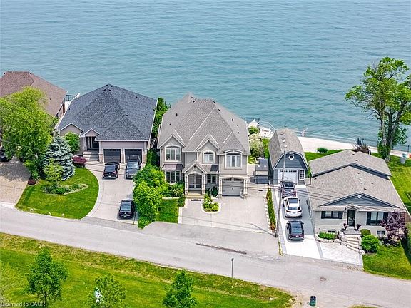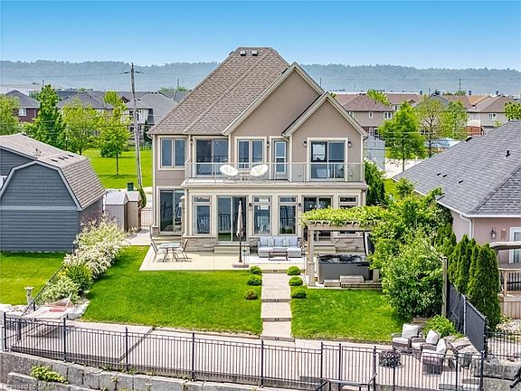 Welcome to this spectacular custom-built lakefront dream home on lake Ontario, located on one of the most prestigious streets in Stoney Creek. Offering breathtaking, unobstructed views of Lake Ontario, this home provides a rare opportunity to enjoy both sunrises and sunsets in a serene natural setting. Step inside to a stunning open-concept design featuring soaring 9-foot ceilings & expansive windows that flood the space w/natural light. As you enter the front door, you’ll pass the elegant open-rise staircase on your way to the heart of the home: a chef’s dream kitchen featuring stainless steel appliances, a built-in coffee machine, wall oven and microwave, gas cooktop, granite countertops & a large central island—perfect for entertaining.The open concept living area boasts gas fireplace, crown molding & custom lighting throughout, creating an inviting ambiance. The spacious primary suite offers a luxurious ensuite bath with a jetted tub and a walk in closet with custom wood inserts, while a second ensuite and third bedrooms includes a walk-in closet with custom wood inserts.Bedrooms three share a stylish Jack-and-Jill bathroom with bedroom four. Upstairs, enjoy a second-floor balcony accessible from two of the bedrooms and a hallway entrance, ideal for relaxing and taking in the lake views. Open concept finished basement with 5th bedroom and 3 piece washroom The professionally landscaped backyard is an entertainer's paradise, complete with a stamped concrete patio, a large Beachcomber hot tub beneath a charming wooden pergola, an automated sprinkler system, and a top-of-the-line Napoleon gas outdoor kitchen with dual doors and ample storage. This home also features exterior recessed pot lights in the roof adding to the curb appeal. Ample parking spots to fit 7 cars. Conveniently located just minutes from the new Confederation GO Station, Costco, parks, wineries, restaurants, and top-rated schools. Don't miss your chance to own this extraordinary lakefront retreat!