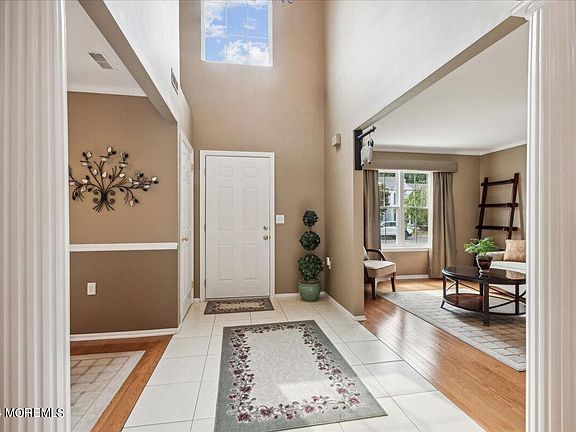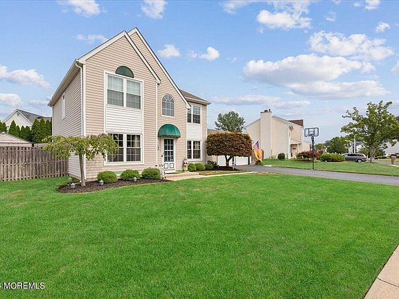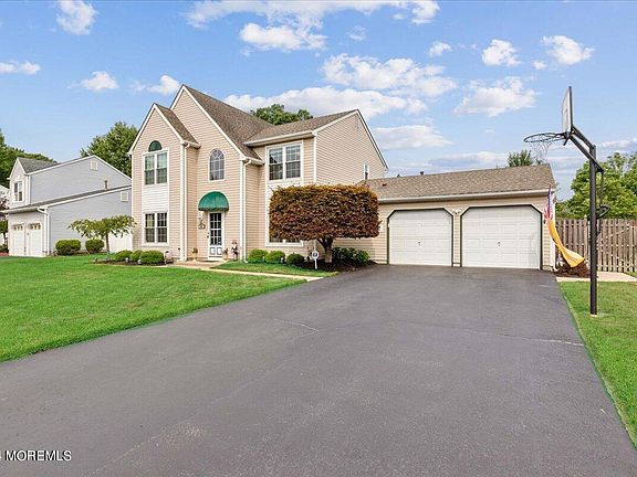 Welcome to this stunning 3-bedroom, 2.5-bath Center Hall Colonial, nestled in the sought-after Sunrise Station development in Howell Township. From the moment you arrive, you'll be captivated by the meticulous curb appeal and lush, professionally landscaped grounds. Step through the grand two-story foyer and be greeted by gleaming hardwood floors that flow seamlessly throughout the home. The entertainment-sized dining room is perfect for hosting gatherings, while the sun-filled eat-in kitchen is a chef's dream, offering ample space and light for culinary adventures. A beautifully appointed powder room and a cozy family room, complete with sliders leading to the backyard, make this home ideal for both relaxation and entertaining. Each nicely sized bedroom features ceiling fans, ensuring comfort year-round, and the newly renovated main bath is simply gorgeous. The primary suite is a true retreat, boasting vaulted ceilings, a stunning primary bath, and a walk-in closet with custom organizers. The pull-down attic with stairs provides additional storage space. This home also boasts numerous updates, including new windows with a transferable warranty, a new sliding door, and a tankless hot water heater. The entire house has been freshly painted, and the large laundry room and 2-car direct entry garage add convenience and functionality. Step outside to your own private oasis. The fully fenced, country club-style yard features an inground pool with a new liner and cover, an oversized patio perfect for outdoor entertaining, and a pergola with lighting for those cozy evening gatherings. 4 sheds provide ample outdoor storage, while the mature landscaping offers both beauty and privacy. Ideally located to NYC transportation, shopping, and beaches, this home is a perfect 10. Don't miss the chance to make it yours!