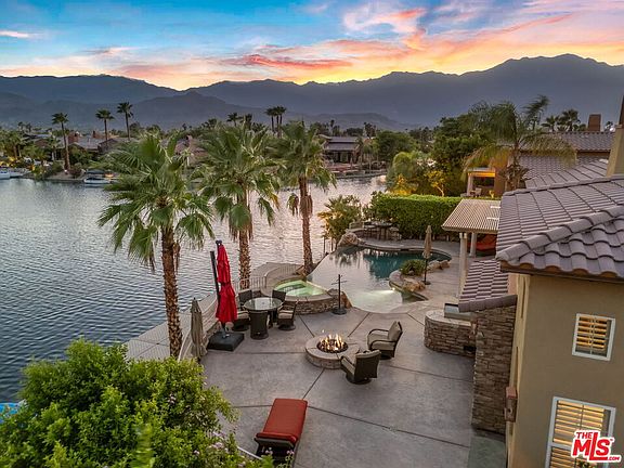 RARE OPPORTUNITY TO OWN ONE OF THE MOST SPECTACULAR AND LARGEST HOMES IN SANTO TOMAS!!! LUXURY LAKE FRONT DESERT LIVING AT ITS FINEST!!! Perfectly situated on a premium SOUTH-FACING lot in the highly desirable gated lake community of Santo Tomas, 64 Via Santo Tomas offers a unique south-facing backyard with plenty of luxurious amenities - infinity pool with a tanning ledge, hot tub, built-in BBQ station, fire pit, fireplace, and steps leading to the massive private dock. Located at the center of the community with unobstructed open water views of the nine acre lake, this home (one of only three) is perfectly situated directly across from the main entrance gate. The 3,350 sqft house boasts four bedrooms and four-and-a-half bathrooms (four are en-suite) with upgraded Kentucky Oak floors, security system, two car garage with plenty of storage space, two indoor fireplaces (one gas and one wood-burning), a bar area, and separation of bedrooms for added privacy. Granite countertops, stainless steel appliances, plenty of cabinets, and a walk-in pantry in the massive kitchen allow for easy entertaining. Two of the bedrooms can be used as an attached casita with a separate entrance door. Home comes fully furnished and has many upgrades - roof (2023), HVAC unit (2024), air conditioned garage, misters in the covered patio, and so much more. Low HOA dues includes a social and sports membership to the Mission Hills Country Club (pool, tennis, fitness, croquet, pickleball, restaurant). Enjoy desert living at its finest!