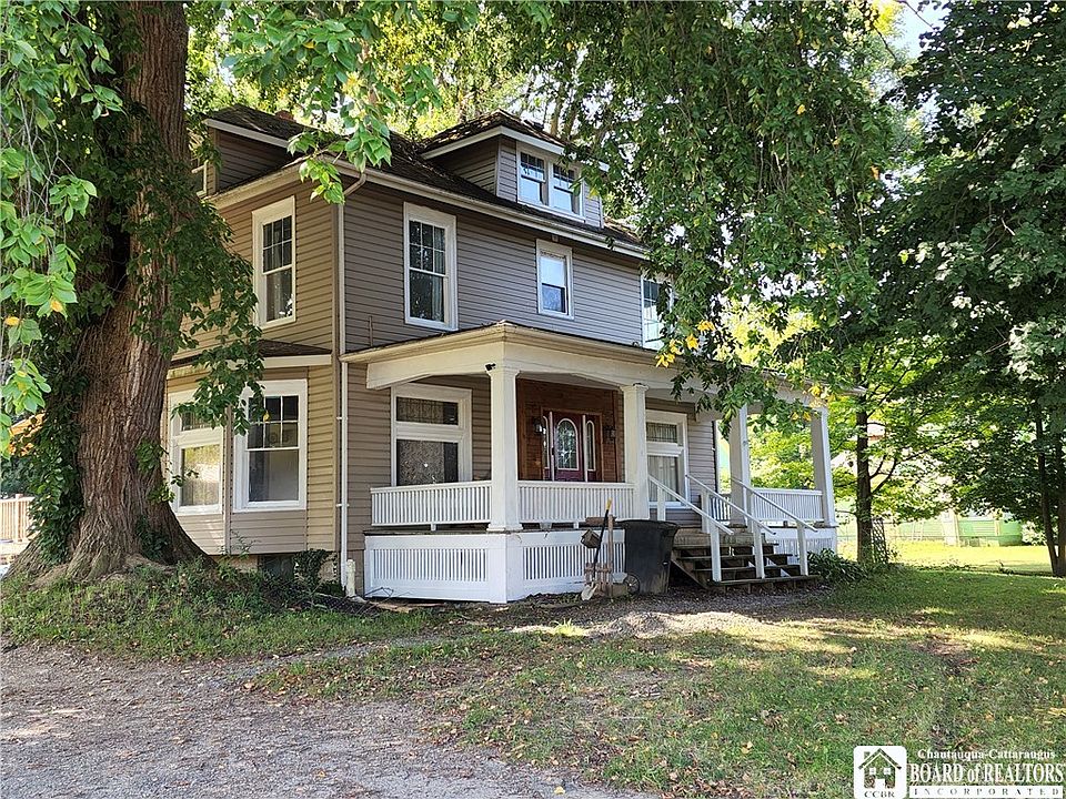 Welcome to 64 W. Main St., Brocton! Upon opening the door from the large covered front porch on this spacious 1940s home, you will be invited into a home that welcomes you with original hardwood floors, built-ins, and oversized windows. The foyer flows nicely into the spacious living room with wood-burning fireplace as well as the formal dining room which overlooks the side yard. The kitchen is open to the dining room with a breakfast bar and leads to the basement, a half bath, as well as a large rear covered porch and the back yard. Heading upstairs you will find 2 spacious bedrooms with a large 3rd which was once two separate rooms, a full bath with a soaker tub, and stairs to the full, partially finished attic that could serve as additional bedrooms or a fun space for an office, hobby room, and more!
