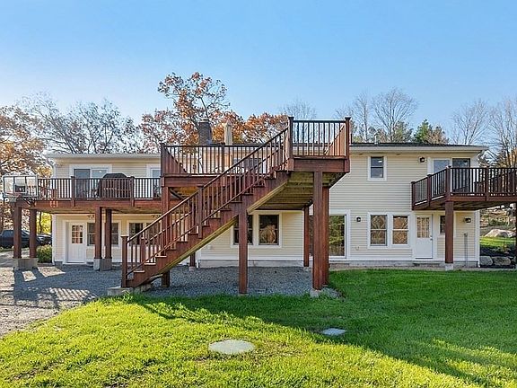 Single level living at its best plus a fully finished lower level provides potential in-law possibilities! Both levels have open floor plans. First level features include hardwood throughout, laundry room with pantry, stainless steel appliances, granite counters and gas fireplace. The master suite includes mahogany deck, walk-in and linen closets and private bath. Lower level includes full kitchen with dining area, great room with wood burning fireplace, Andersen windows, slider and tiled bath with double vanities. This home was completely gutted with all permits. Renovations include new plumbing and heating, 4 zone radiant heat and forced air, central A/C, recessed lighting, solid cedar siding, radon remediation and mahogany decks. Too many to list! Enjoy the fire pit and the sounds of the water feature on this professionally landscaped lot. Garages, 700sqft, were converted to a studio which owners can reconvert or credit buyer at closing.