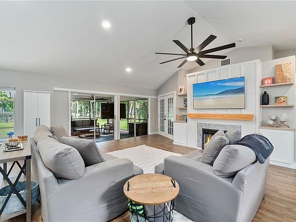 Welcome HOME to your private Golden Gate Estates retreat! Nestled on 2.27 acres of manicured land, this 3bed/2bath gem perfectly blends comfort and modern design. Ideally located in sought-after Golden Gate Estates location, just off Golden Gate Boulevard! Tucked away from the road, this updated property offers extra privacy and curb appeal. Step inside to a welcoming living area featuring vaulted ceilings and a custom feature wall with a built-in electric fireplace and TV (included) - a stunning focal point for both relaxation and entertaining. The open-concept kitchen has been tastefully updated with soft close shaker cabinets, upgraded counters, and stainless steel appliances. Both bathrooms have also been beautifully renovated. Enjoy peace of mind with major recent upgrades to include a NEW METAL ROOF (2024), NEW PEX PLUMBING (2020), and a newer water heater (2019). The home is also equipped with a whole-home Reverse Osmosis System so you can ensure pure water throughout. Additional features include wood plank tile flooring, updated light fixtures, newer interior and exterior paint, newer A/C ductwork, a property fence, a charming shiplap accent wall in the guest bedroom, and a comfortably-sized laundry room with storage space. Relax on the expansive screened-in lanai and enjoy your morning coffee surrounded by nature! This darling home truly delivers all the good vibes; see it today!