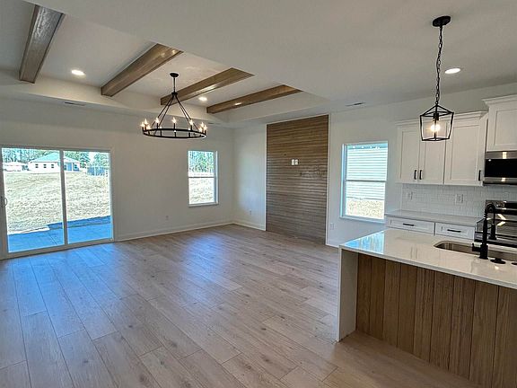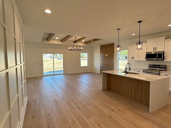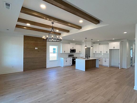 Beautiful beams in ceilingGranite waterfall kitchen islandCovered porchOpen floor planCustom wall trim outs