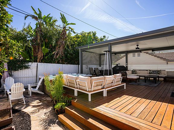 This home includes owner paid solar panels for you to save on your energy bill, two fireplaces, one in the living room and one in the den, creating warm and inviting gathering spaces. The outdoor living area is a true retreat, featuring a fully covered patio with recessed lighting, built-in audio speaker system setup capability, a mounted TV, commercial infrared heaters, and ceiling fans for year-round comfort. Step outside to enjoy an extra-large 10-person hot tub and three fruit trees Valencia orange, Meyer lemon, and Mexican lime.