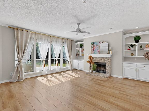 Stylish brick fireplaceOpen floor planExpansive windowArched windowsDedicated workspaceGranite countertopsGenerous windows