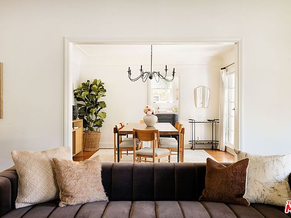 A chic 1922 English Tudor in Larchmont Village. Thoughtfully remodeled and upgraded by its current owners, this residence offers a welcoming retreat surrounded by lush greenery and romantic outdoor spaces, featuring a 3-bedroom, 2-bathroom main house plus a detached studio with laundry and full bath. The light-filled kitchen showcases elegant stone countertops, custom cabinetry, brass fixtures, Thermador appliances, and wraparound windows with direct access to the backyard. Formal dining room and spacious living room make a grand statement, with custom drapery and window coverings. Two charming guest bedrooms and a beautifully upgraded hall bath complement the sumptuous primary suite, which features a designer five-piece bathroom and dual closets. A private backyard offers multiple areas for relaxation and entertaining. Off the primary suite and second bedroom, French doors lead to an elevated patio framed by olive trees. The detached guest studio, featuring dual French doors, vaulted ceilings, and a full bath, makes for an ideal home office, creative space, or guest quarters. A grassy yard and graveled dining area set among mature trees complete this manicured oasis. Recent upgrades include a new roof and foundation improvements. Located in the sought-after Third Street Elementary, and a stroll to all the wonderful shops and restaurants in Larchmont Village that make this neighborhood so coveted.