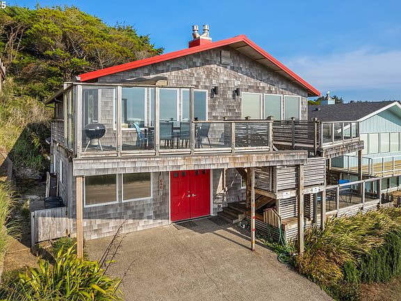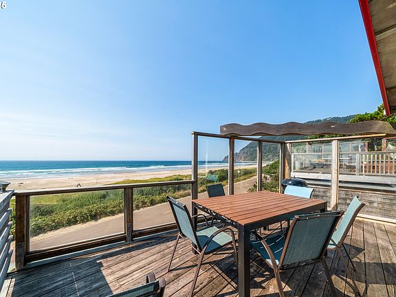 Versatile oceanfront living in the heart of Manzanita! Unrivaled views of the ocean, beach, and iconic Neahkahnie Mountain from every level of this exceptional home with easy beach access. Designed for flexibility, this legal duplex functions beautifully as a single-family residence with an attached unit for a multigenerational retreat, or as a primary home with potential for a short or long-term rental income unit. Enjoy expansive deck space with a protective glass windbreak, perfect for soaking in the views with a sheltered place to relax, BBQ, and enjoy the outdoors, even during those summer NW winds. Features include 8 bedrooms, 4 baths, 2 full kitchens, 1 kitchenette w/wetbar, 3 propane fireplaces, and shared laundry across 3,387 sq ft. Set on an oversized .16- acre lot with durable cedar siding and metal roof. Property meets current code for duplex use. Sold partially furnished (minus list of exclusions). Buyer to verify short-term rental regulations for intended use.
