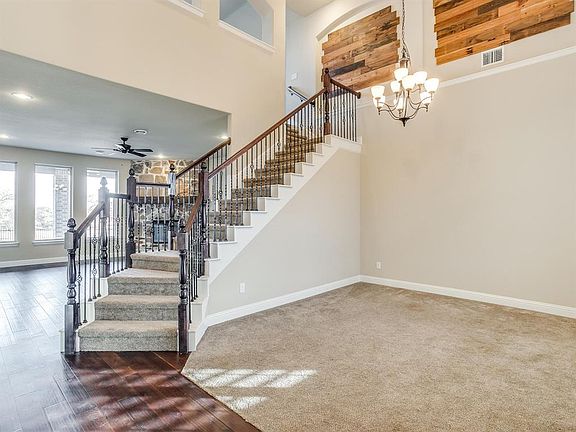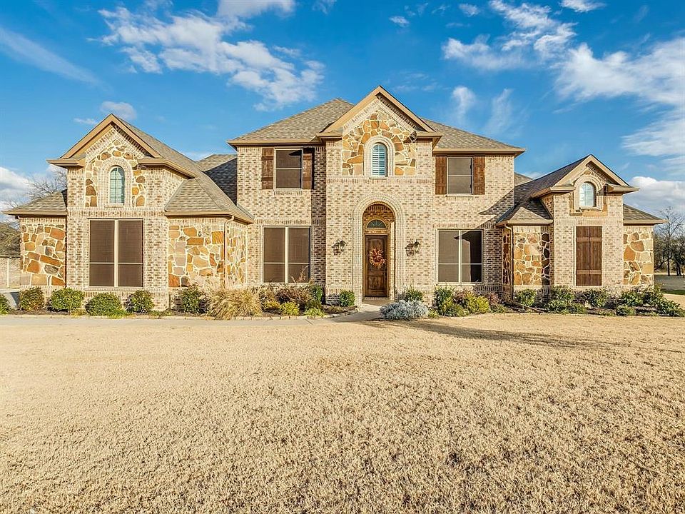 Outstanding brick and stone 2 story on 1.001 landscaped acres in the highly desired Prairie Timber Estates neighborhood. Home features 3 bedrooms, 2.5 baths, first floor master with walk in shower, separate tub, oversized walk in closet. First floor office, spacious kitchen which overlooks the family room with wood burning fireplace. Views to the open back yard from family room. Upstairs there are two additional bedrooms and a 2nd living area. 3 car garage with expanded parking pad. 2 mounted flat screen tv's convey. Highly efficient home with $saving water heater. Addl walk in attic storage. 11 zone sprinkler system, low utility bills and foam insulation.