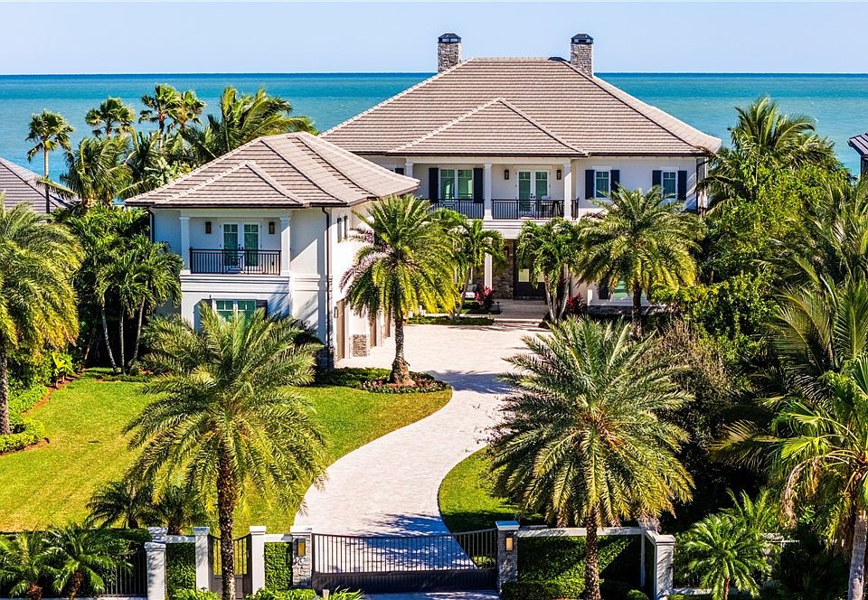 Discover luxury oceanfront living on 1.09 elevated and secluded acres with 104' of beach frontage. Built in 2016, this 5BR/5.4BA coastal estate has dual primary suites, private guest suite, gourmet kitchen, custom office, SAVANT system, custom bar, elevator and laundry rooms on both floors. Effortless outdoor living from breezy terraces, resort-style pool/spa, summer kitchen, putting green, meticulous landscaping, 4 car garage, gated drive and seawall. Near Moorings Yacht Country Club, marina. Miles from public beach access. Partial staging by Vesta Homes-furniture available for purchase.
