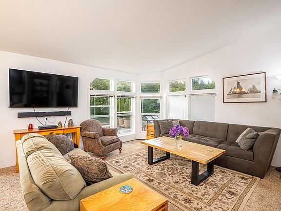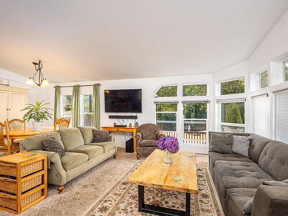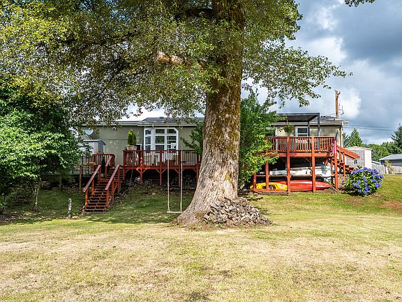 Riverfront home with big deck and large backyard with an amazing shade tree, fire pit and low bank river access for swimming, fishing for salmon and steelhead and kayaking.There are also mature pear, apple and plum trees plus blueberries and the back yard is accessible to vehicles. The deck is on three levels with a shed and a greenhouse at the west end. The six person hot tub and aluminum pergola with a louvered ceiling that can be opened for sun and closed for rain make this deck a year round amenity to enjoy. Kayaks are stored beneath the deck. The bright living/dining room has river views and a corner window bay. The open kitchen has plentiful storage. Bedrooms have ceiling fans and the primary bath was updated with a stand in shower, double sinks and plentiful countertop. The garage has two bays but one door, built in loft storage and wooden shelving plus a shop space.